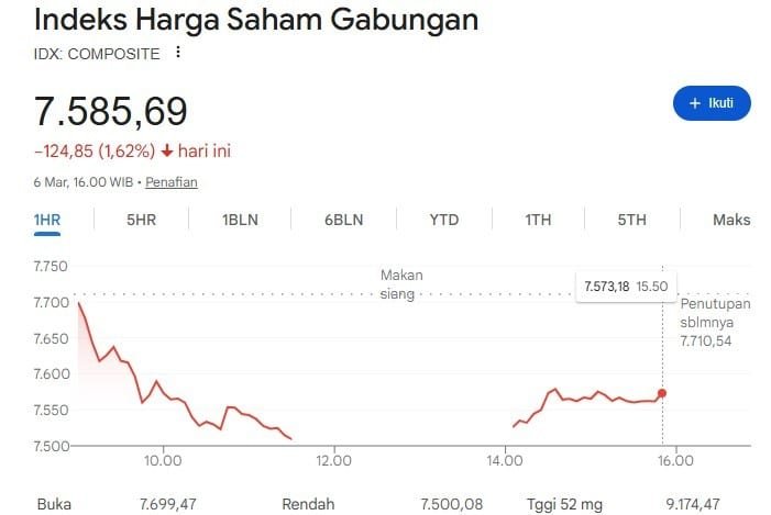 RUANGBICARA.co.id – Pekan perdagangan saham di Bursa Efek Indonesia (BEI) pada periode 2–6 Maret 2026 ditutup dengan tekanan signifikan. Indeks Harga Saham Gabungan (IHSG) tercatat anjlok 7,89% ke level 7.585,687 dari posisi 8.235,485 pada pekan sebelumnya.