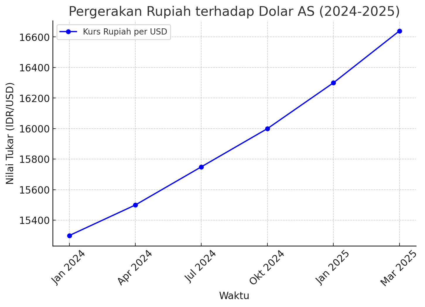 Ditambah nilai tukar rupiah terhadap dolar Amerika Serikat (AS) baru-baru ini mengalami penurunan signifikan, mencapai level terendah sejak krisis finansial Asia 1998. Pada 25 Maret 2025, rupiah melemah hingga Rp16.640 per dolar AS, mendekati rekor terendah Rp16.800 yang terjadi pada Juni 1998.